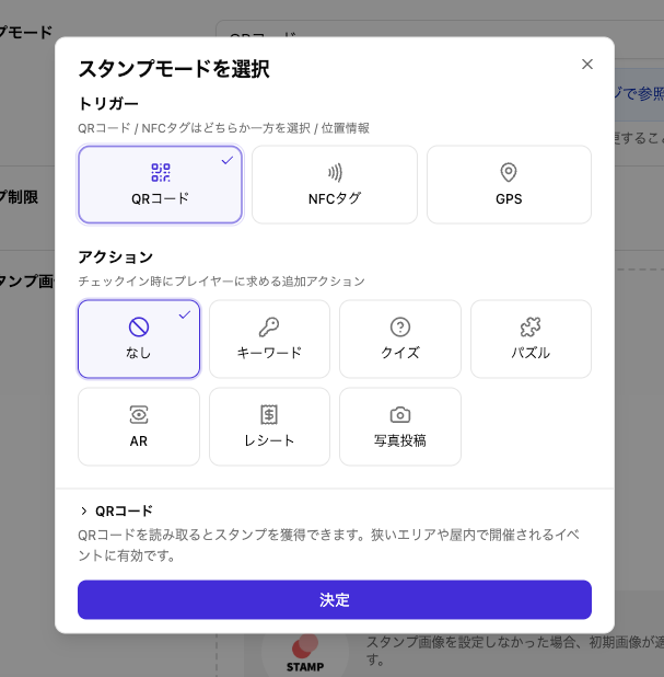 シンプルなQRコードでのスタンプラリーから、AR、レシートキャンペーン、画像投稿など様々な方法でスタンプラリーを開催することができます。レシートや写真投稿にはAIによる自動判定も導入済みです。
